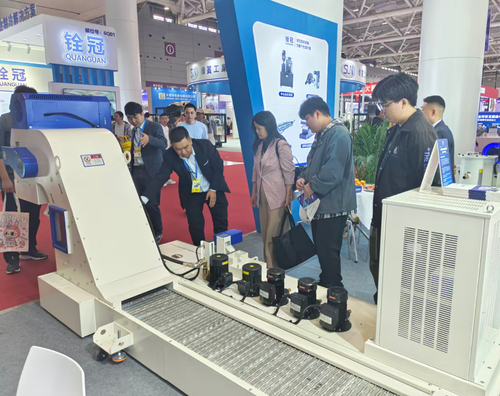 2025年DMP大灣區(qū)工業(yè)展是銓冠首次采用雙展位形式,現(xiàn)場(chǎng)更是首次亮相多項(xiàng)新款產(chǎn)品,特別是6Q05展臺(tái)的鏈板式反沖滾筒排屑機(jī)吸引總多人流,鏈板排屑機(jī)銓冠前面也做過(guò)很多,這次創(chuàng)新在于配置的螺桿排屑裝置,解決了原裝置鏈板內(nèi)部切屑無(wú)法排除的隱患,適用于五軸加工精密機(jī)床的各類型切屑,長(zhǎng)卷團(tuán)塊屑通過(guò)鏈板輸送,細(xì)小切屑通過(guò)滾筒過(guò)濾。